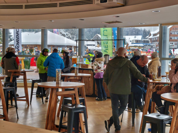 After the formal part of the event, the attendees moved to the oval hall and terrace of our hotel, where the gathering continued in a more relaxed atmosphere. The rhythm was set by a DJ, competitiveness was added through mini skiing games, and the experience was perfectly rounded off by an excellent spread prepared by our catering team. In fact, the aroma of freshly baked šmorn with cream and jam had already subtly made its way up to the top-floor hall during the conference, hinting that the day would conclude in a delightful culinary atmosphere.
